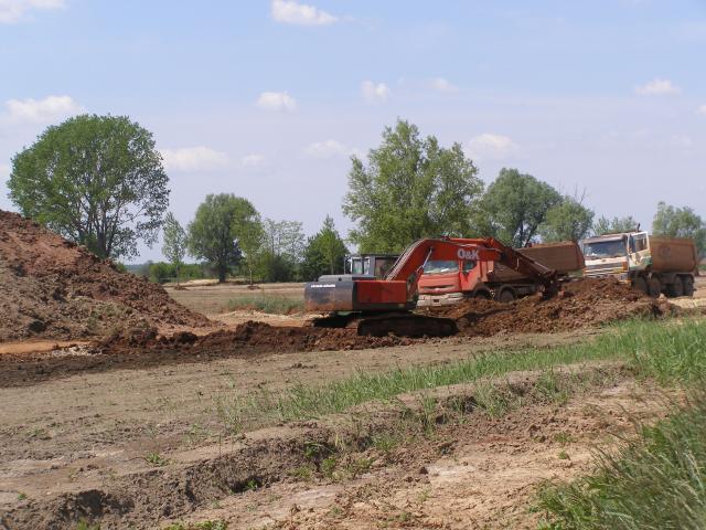 A képen a Devecsert Somlóvásárhellyel összekötő út Torna-pataktól távolabbi oldalán dolgoznak a munkagépek a vörösiszappal kevert felső talajréteg eltávolításán.
