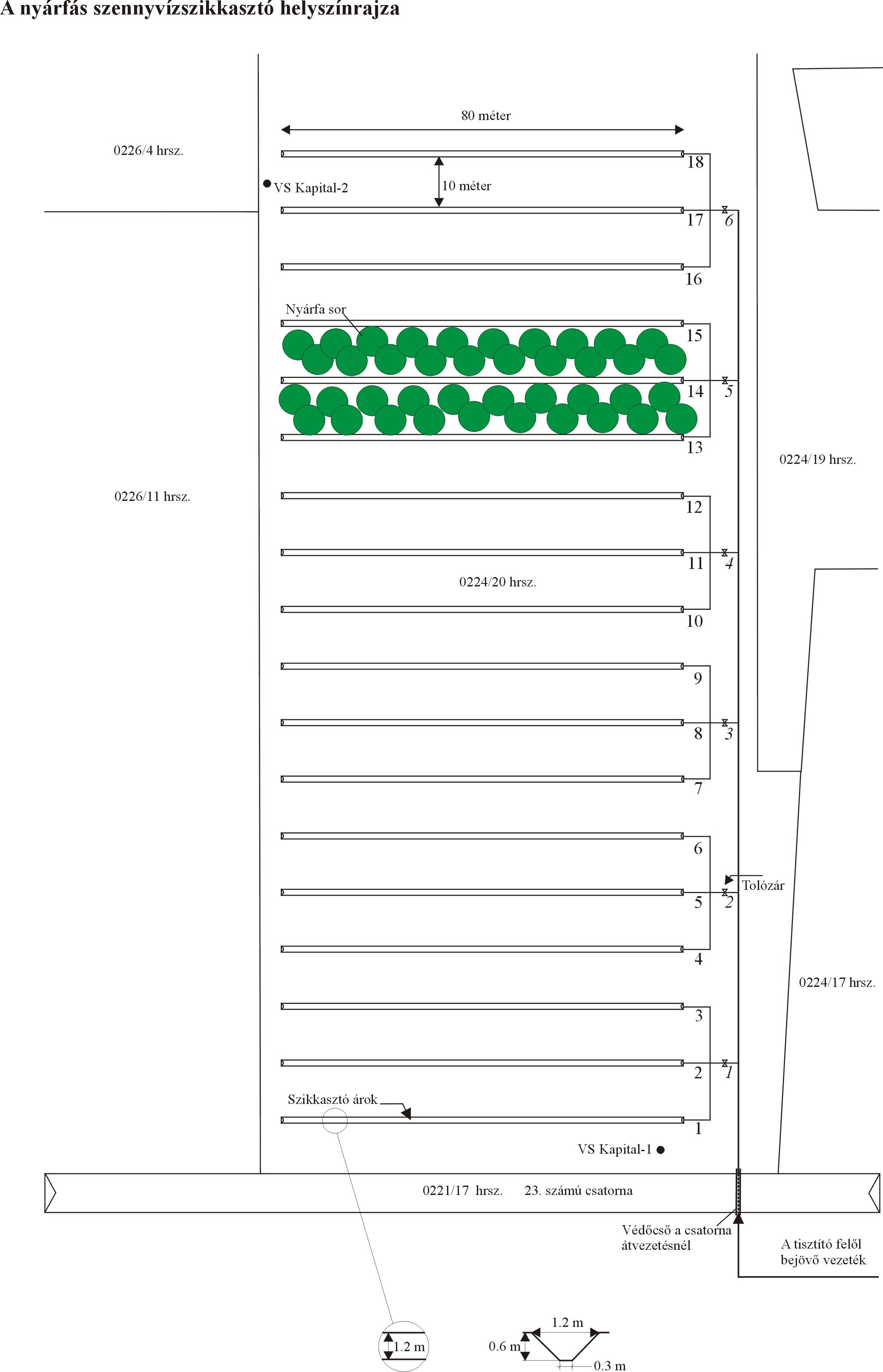 A tisztított szennyvíz kihelyezése árkos rendszerben történik, melyhez 18 db 80 méter hosszúságú, egymástól 10 méterre elhelyezkedő árkot alakítottak ki. Az árkok közötti szétosztás 6 db egyenként 22 fm hosszú DN 65 mm-es KPE ágvezetéken történik, melyek mindegyikét 1-1 db tolózárral lehet ki- illetve bekapcsolni. A tolózárak mögött az ágvezetékek három részre vannak osztva, így 1-1 tolózár működtetésével három árok árasztható el egyidőben.