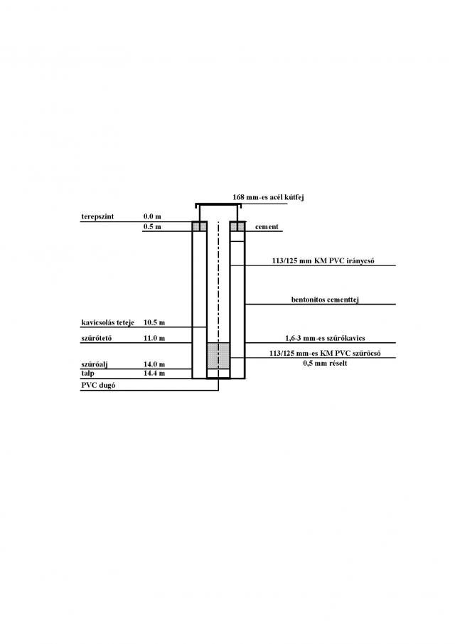A tárgyi kút fúrása URB-2,5-A típusú fúróberendezéssel, száraz fúrási technológiával d = 279 mm-es kanálfúróval történt a megütött vízszintig, majd ezt követően d = 241 mm-es acél védőcső védelme mellett iszapolással értük el a tervezett talpmélységet. Ezután a védőcső védelme mellett, d = 125/113 mm-es KM PVC béléscső rakat került beépítésre a kutba. A 0,5 mm-es réseléssel készült szűrőzött szakasz hossza 3,0 méter. A szűrőzött szakasz alá 0,4-2,0 méteres ülepítő szakasz (iszapzsák) került beépítésre a fúrás során észlelt vízszint függvényében. A kutak talpelzárására PVC dugó került beépítésre. A szűrőváz kialakítása 1,6-3,0 mm-es osztályozott szűrőkaviccsal történt a d = 241 mm-es védőcső fokozatos visszahúzása mellett, folyamatos tömörítéssel, a szűrőzött szakasz teteje felett 0,5 m-ig. A szűrőváz kavicsolt szakasza felett a gyűrűstér feltöltése bentonitos cementtejjel történt a terepszintig a felszíni szennyeződések kútpalást mentén történő vízadó rétegbe jutásának megakadályozása érdekében.
