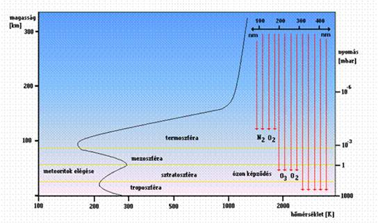 A képen a Földi atmoszféra szerkezete és jellemzői láthatóak a hőmérséklet, nyomás és hőmérséklet függvényében.