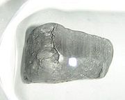 Megjelenés | A tiszta tallium ezüstfehér, puha fém (késsel vágható). A természetben tiszta állapotban nem fordul elő, de vegyületei meglehetősen elterjedtek, de mindenütt csak csekély mértékben találhatók, némely kovandokban, legnagyobb mennyiségben egyedül a crookesitben (16,27-18,55%). A levegőn igen gyorsan vékony oxidréteg képződik a felületén, Vörös izzáson a vizet elbontja és higított kénsavban hidrogénfejlődés közben feloldódik. Az oxigénnel, klórral, brómmal, jóddal, kénnel stb. igen könnyen egyesül. [2]; [4]; [5] | ||||||||||||||